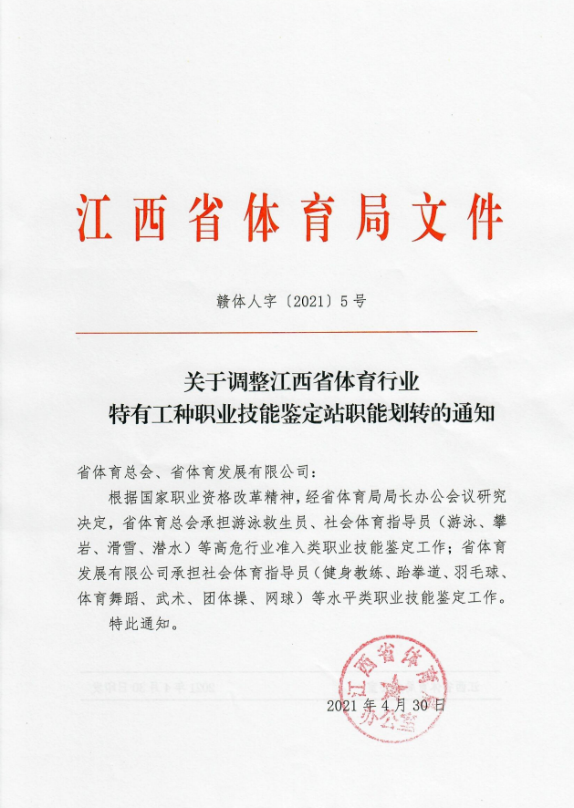 根據(jù)國(guó)家職業(yè)資格改革精神,國(guó)家體育總局職業(yè)技能指導(dǎo)中心于2021年1月份全國(guó)各省職業(yè)技能鑒定站發(fā)出通知,2020年底前水平評(píng)價(jià)類職業(yè)資格全部退出職業(yè)資格目錄清單。江西省體育局黨組高度重視省國(guó)家職業(yè)資格改革舉措,將體育行業(yè)水平類職業(yè)技能認(rèn)定工作職能劃撥給江西省體育發(fā)展有限公司,今后省體發(fā)公司將更好的服務(wù)全省體育行業(yè)從業(yè)者。
